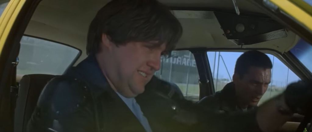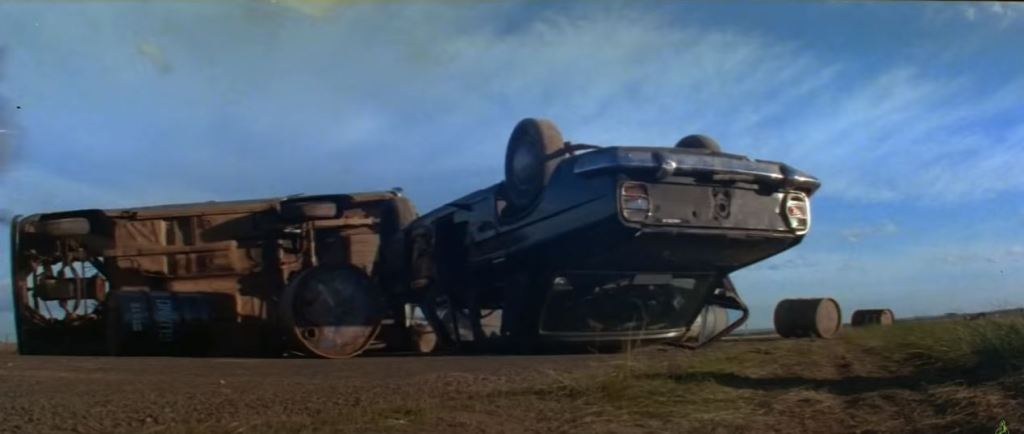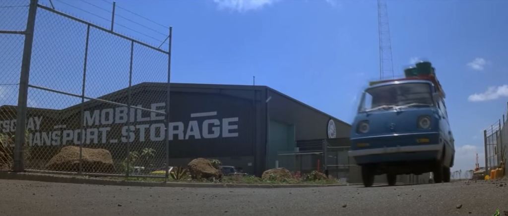 A bongo van pulls out of a nearby storage facility. The moving van in the initial shot of it turning onto Cherry Lane was George Miller’s personal transport. The van getting hit by Big Bopper was an empty shell with no engine.