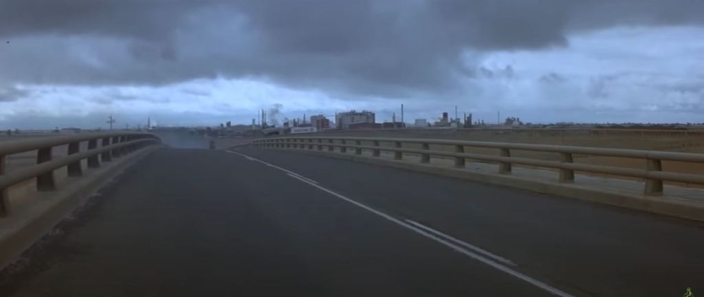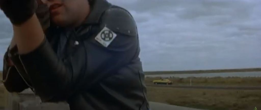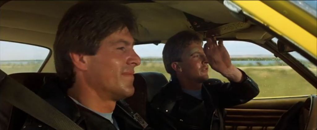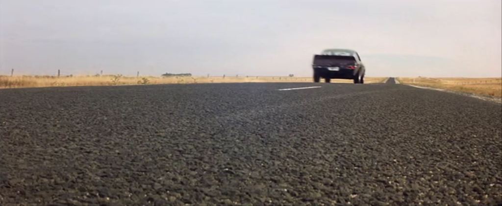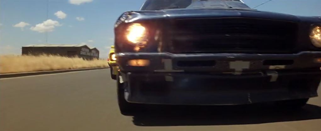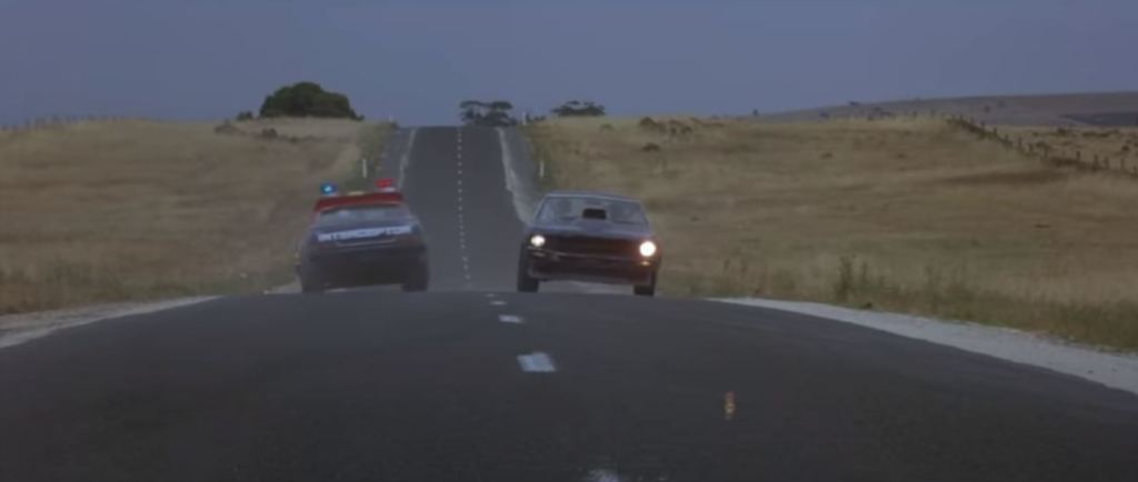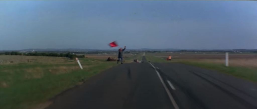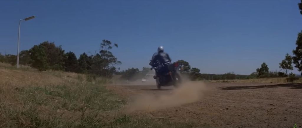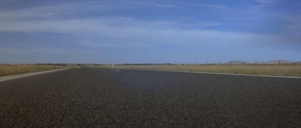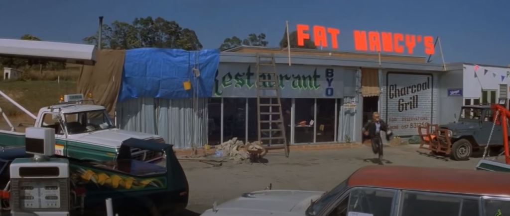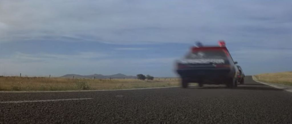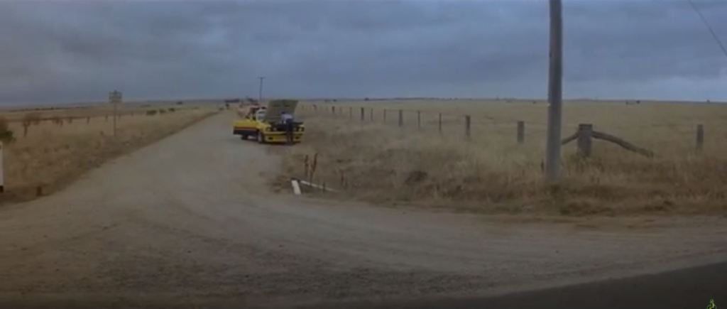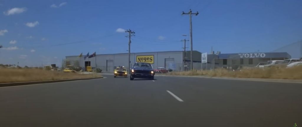Goose is in a truck stop café eating lunch. The chase flies past and he runs out to his motorbike to get involved. This diner was the Pretty Sally Roadhouse, on the Northern Highway. It’s private property nowadays, and has become very dilapidated, but from photos online, various attributes of the building such as the ‘Charcoal Grill’ signage are still visible. The slip road from the second screenshot below is still visible on Street View – just drive up the road a bit and you’ll see where it joins the Northern Highway.