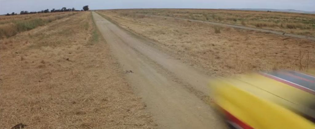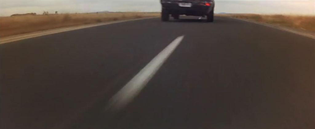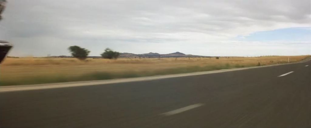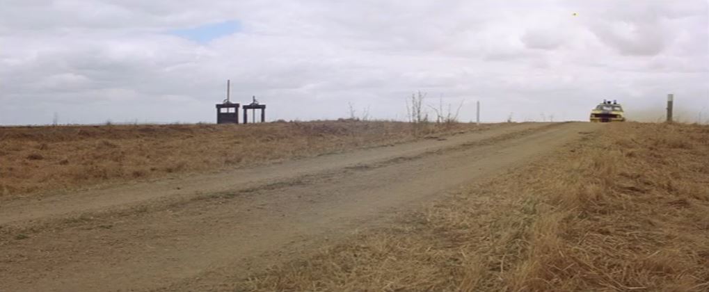 Location: [Unconfirmed] Bacchus Marsh Road. Not many clues to go on here, but we can work on the assumption that the main chase on the clear open roads was shot on Bacchus Marsh Road. The group of trees on the horizon (and the ones to the left of it that are mostly hidden behind the roadside undergrowth) is the only clue we have to work on here, as well as the undulating road surface. What makes recognition even more difficult here is that George Miller wanted a low down viewpoint for a lot of the vehicle action, whereas the Google Street View cameras are mounted high on top of their cars.