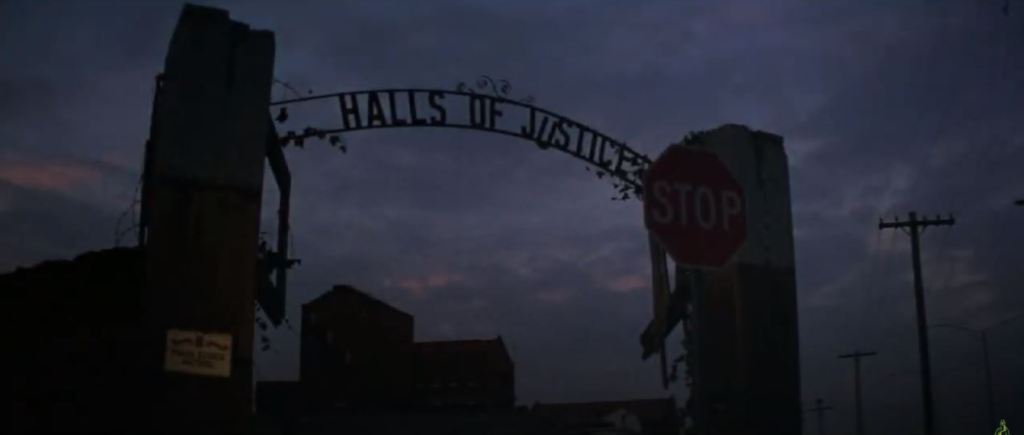 The film begins with scene-setting shots of the Halls of Justice looking dilapidated and desolate roads with warning signs setting a scene of future dystopia.