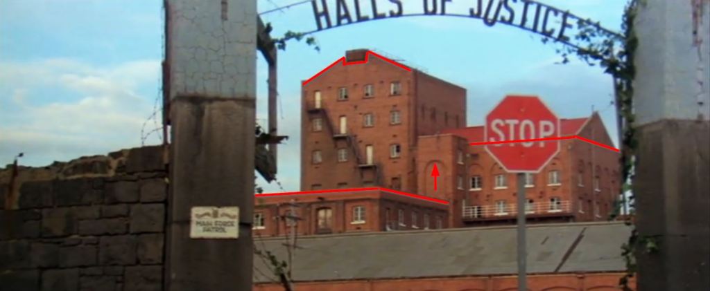 Let’s do a little then-and-now comparison: of the two photos below, this first is a shot of the same buildings from later on in the film (because they’re more visible due to it still being daylight). I’ve marked out some features that will identify the buildings in modern Street View.