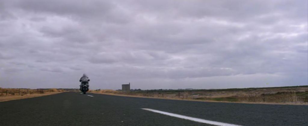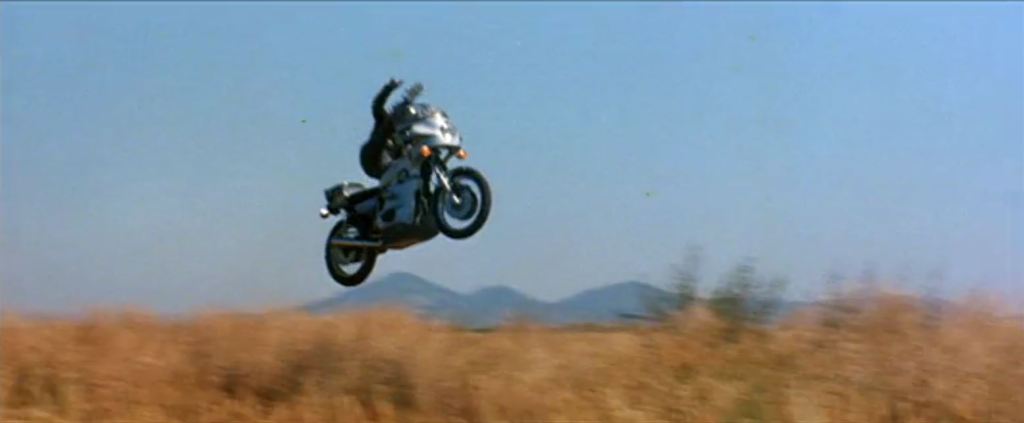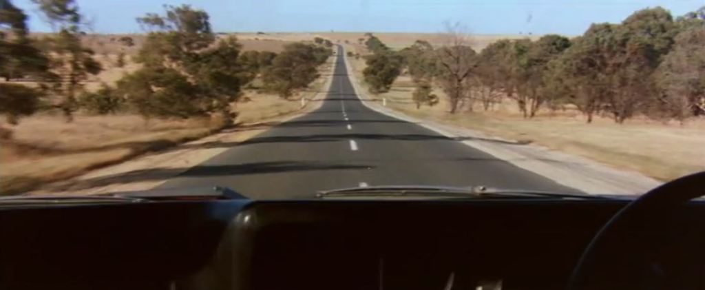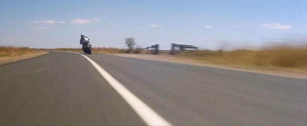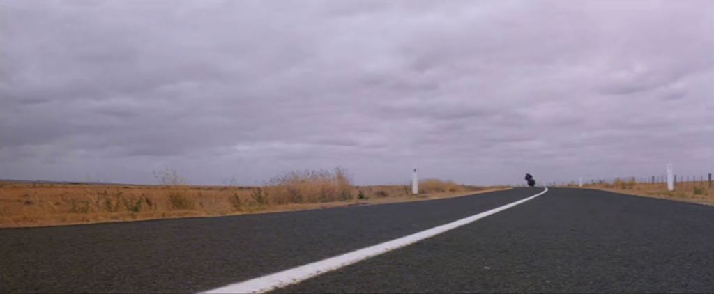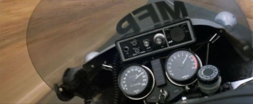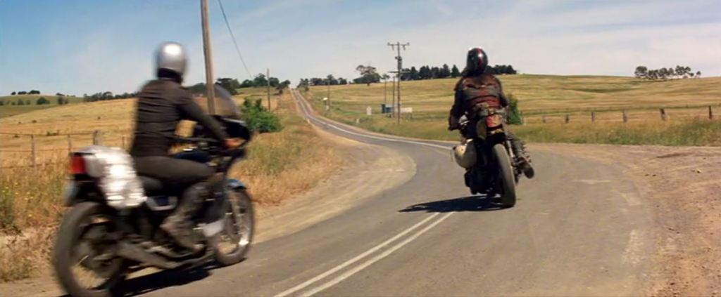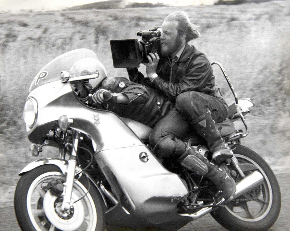 …and this is how they filmed the scene. Cinematographer David Eggby on the back of a Kawasaki with president of the Vigilanties biker club Terry Gibson driving.