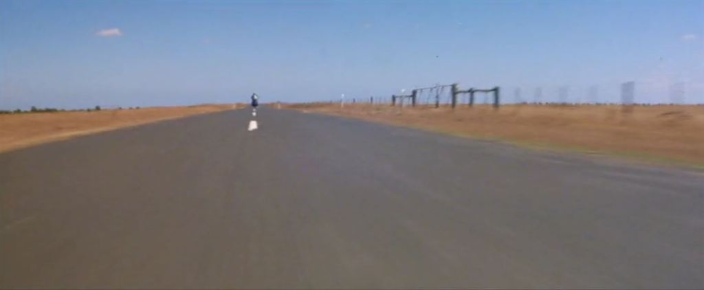 Location: Twentynine Mile Road. An ammunition bunker similar to the one used by Roop at the beginning of the film is visible in the background. Swing the Google Street View around to face the other way and you will see the bend in the second screenshot.